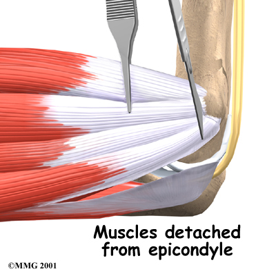 The other method simply on the inside edge of the elbow, a procedure called medial epicondylectomy. By getting the medial epicondyle out of the way, the ulnar nerve can then slide through the cubital tunnel without pressure from the bony bump.