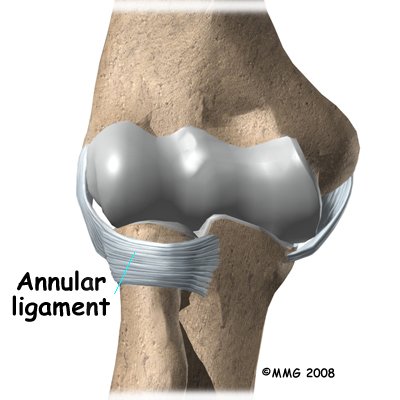 There is also another important ligament called the annular ligament that wraps around the radial head and holds it tight against the ulna. The word annular means ring-shaped. The annular ligament forms a ring around the radial head as it holds it in place. This ligament can be torn when the entire elbow or just the radial head is dislocated.