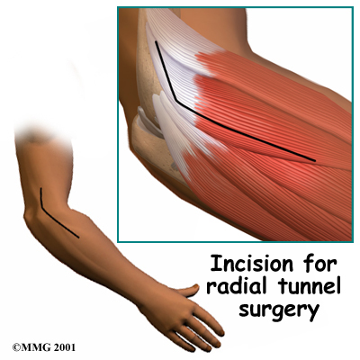 Radial tunnel surgery can usually be done as an outpatient procedure. This means you won't have to stay in the hospital overnight. Surgery can be done using a general anesthetic, which puts you to sleep, or a regional anesthetic. A regional anesthetic blocks nerves in only one part of your body. In this case, you would have an axillary block, which would affect only the nerves of the arm.