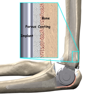 There are two different ways to hold the artificial elbow in place. A uses a special type of epoxy cement to glue it to the bone. The has a fine mesh of holes on the surface. Over time, the bone grows into the mesh, anchoring the prosthesis to the bone.