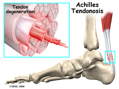 The healing process in the tendon causes the tendon to become thickened as scar tissue tries to repair the tendon. This process can continue to the extent that a nodule forms within the tendon. This degenerative condition without inflammation is called tendonosis. The area of tendonosis in the tendon is weaker than normal tendon. Tiny tears in the tissue around the tendon occur with overuse. The weakened, degenerative tendon sets the stage for the possibility of actual rupture of the Achilles tendon.