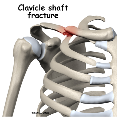 A fracture of the shaft of the clavicle is a common injury and is often caused by a direct impact on the mid-portion of the clavicle. A bending force can also cause it where the force that pushes the shoulder back results in a mid-shaft fracture of the clavicle with the outer part angled back. This can be an open fracture as the sharp end of the broken bone cuts through the skin. Mid-shaft clavicle fractures can also be the result of a fall on the outstretched hand. The force is transmitted up to the clavicle, as it is the link between the arm and the rest of the skeleton. Fractures of the shaft of the clavicle have a good reputation for healing and are often treated non-operatively.