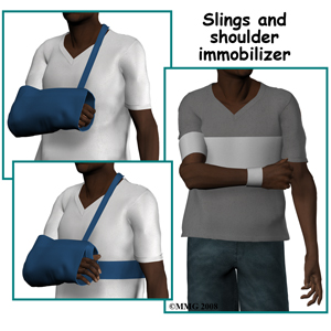 Non-surgical treatment is employed commonly. Nearly all fractures of the sternum, the collarbone, the blade of the scapula, the acromion and coracoid processes as well as the neck of the glenoid are treated without attempting to improve the position of the fracture or fix it. Symptomatic treatment usually includes using a sling to limit movement of the shoulder and for pain relief as they prevent the weight of the arm dragging on the painful part. Most slings are suspended round the neck, which unfortunately can get uncomfortable. An arm immobilizer is available in some hospitals; this goes round the chest and supports the forearm and the arm just above the elbow to ease this discomfort.